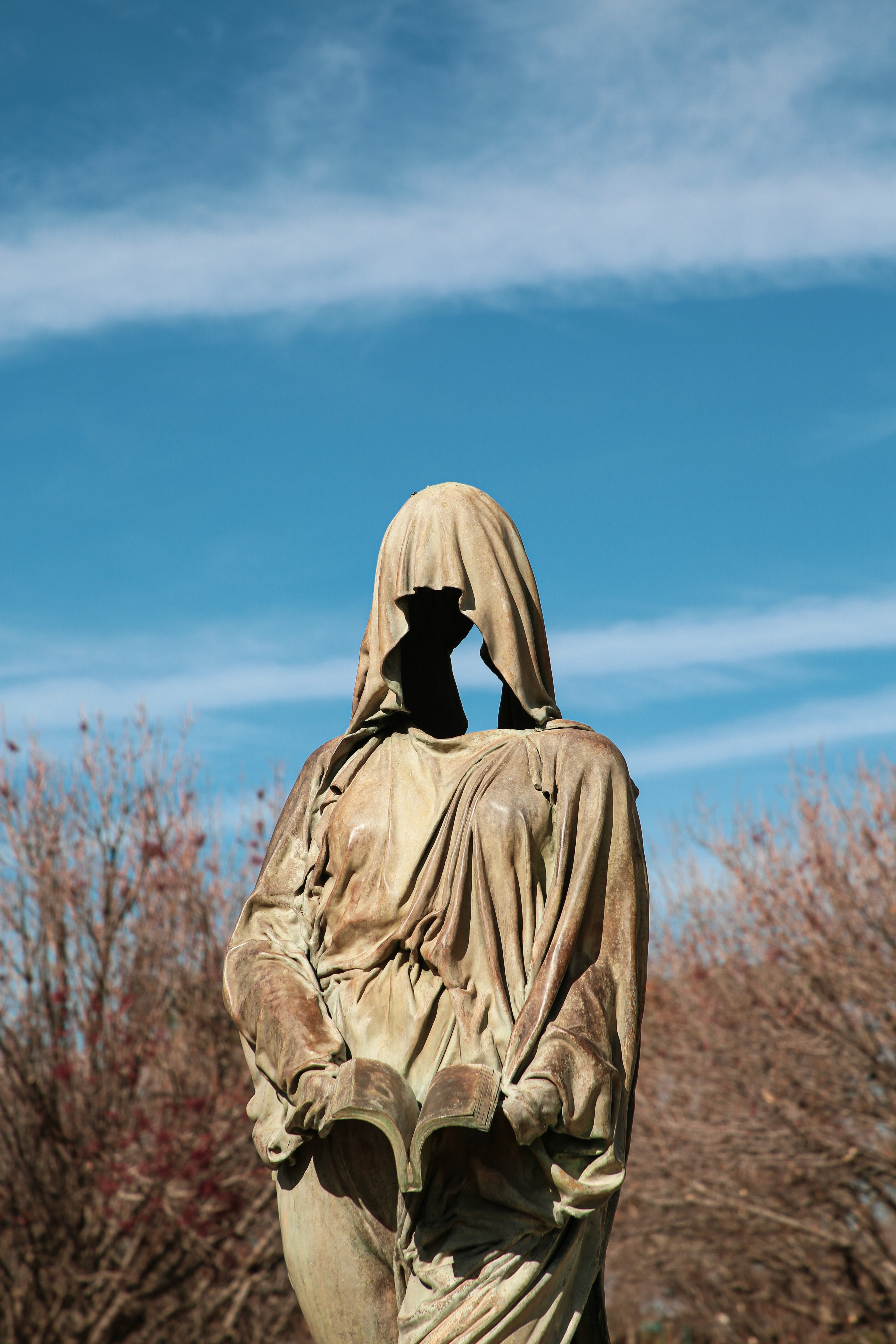 A faceless figure holds an open book, offering knowledge without identity.